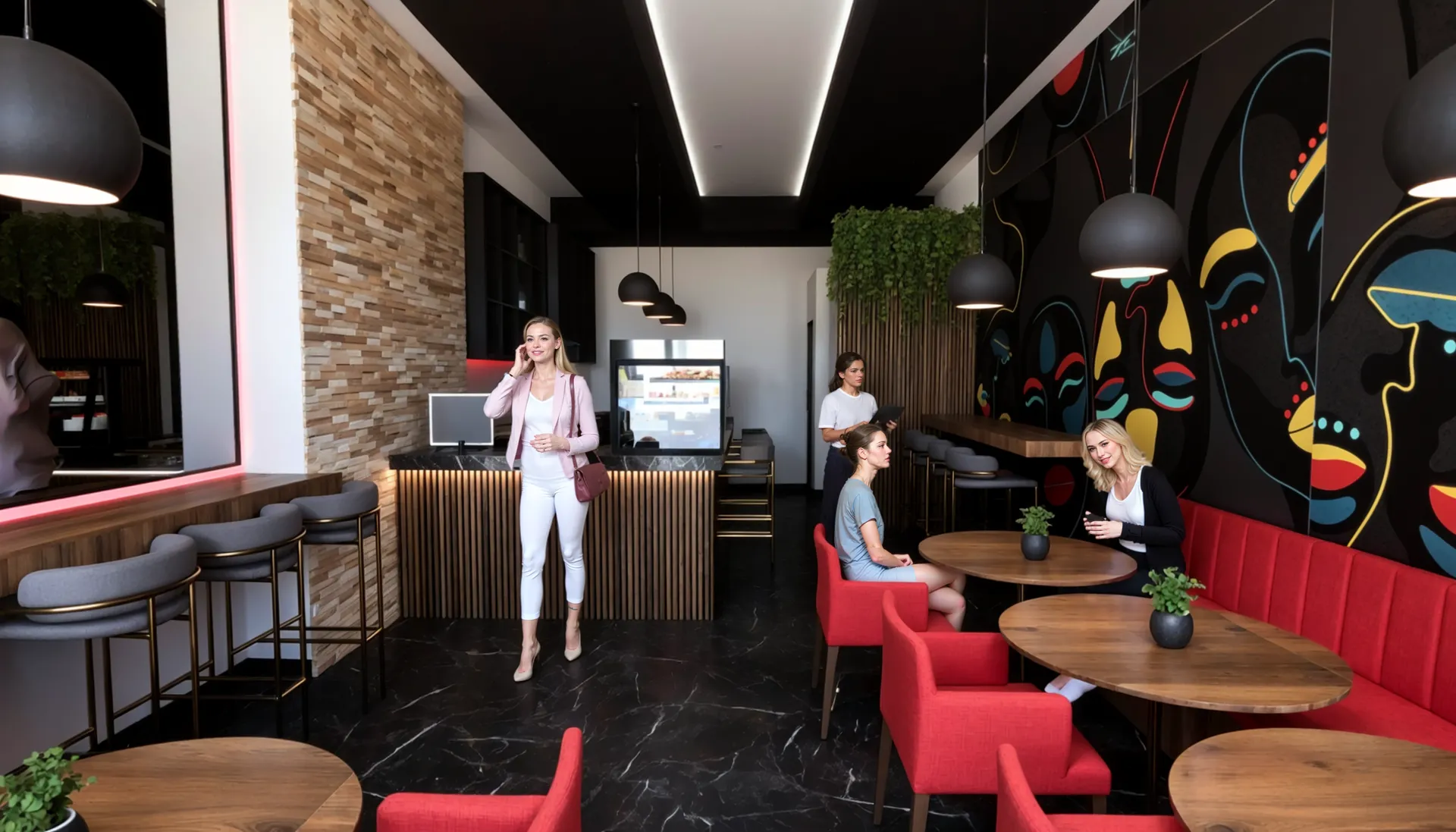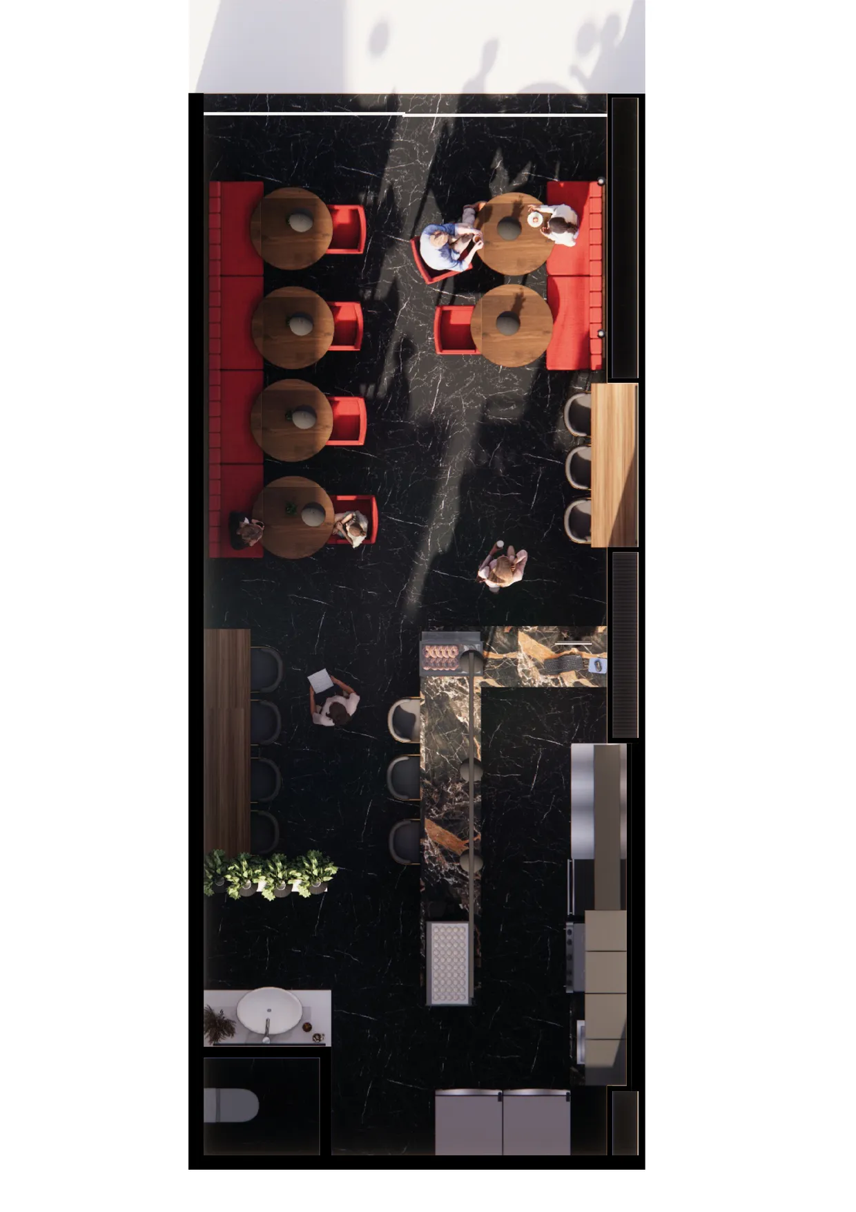 La solución integral para BRÜLÉE CAFE & BAR se basa en un diseño multifuncional que optimiza cada metro cuadrado del espacio disponible. La distribución estratégica permite una transición fluida entre las funciones de cafetería y bar, maximizando la capacidad sin comprometer la comodidad.